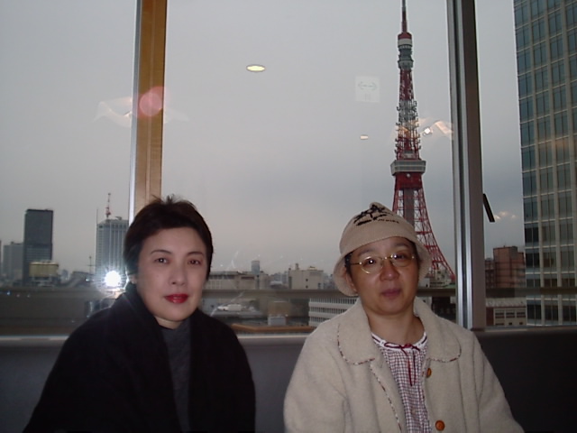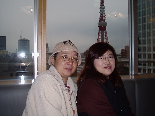 8階のレストランにて・・。東京タワーと、ペコさんの勝利宣言のピースサイン♪(^_^)v