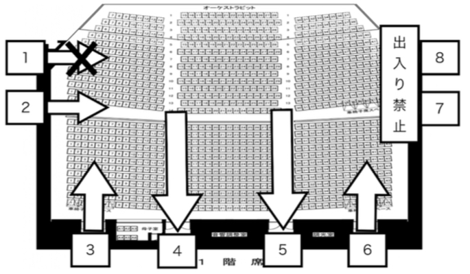 1階客席は、入退場の扉が指定されています。安全な入れ替えにご協力をお願いします。