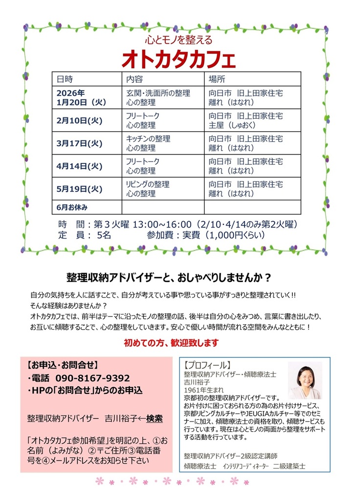 オトカタカフェでは、モノの整理だけでなく、心の整理も進めていきます