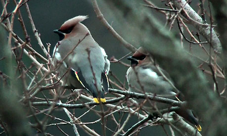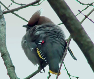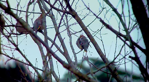 久々に妙見山頂に姿を見せたキレンジャクの群れ(9羽)。18日の夕刻、駐車場と妙見水広場の中間点でした。