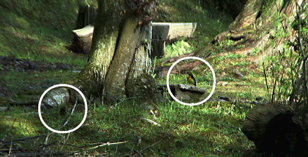 キビタキのオスはあずまや周辺で。ホオジロと仲良く地面に降ります。メスもやって来ていましたからきっとカップルが成立したのでしょう。