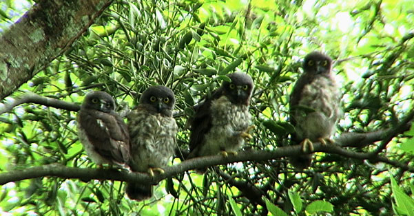 野間の大ケヤキ、アオバズクのヒナです。ヒナは3羽だと思われていましたが、46年ぶりの皆既日食の早朝、4羽めのヒナが洞から出てきました!皆既日食のさなか、全員集合してこちらを向いてくれました。希少な瞬間です。