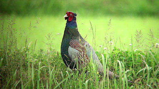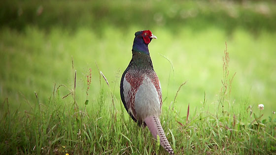 野間には田圃が広がっていますが、そのあぜ道を歩くキジです。繁殖期なので両頬の紅い肉垂がとても目立っています。途中で立ち止まり、「ケン、ケーン」と鳴きました。