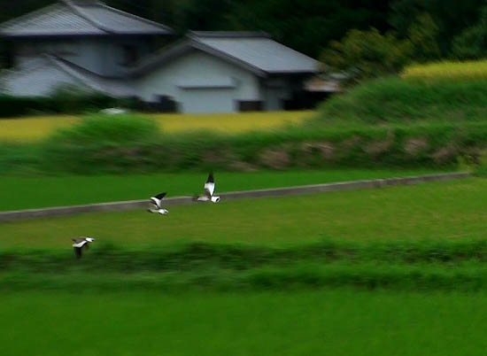 稲穂が重く垂れさがった田んぼと、もう稲刈りを済ませた田んぼ。うまく姿を隠していたのに、突然飛び上がり、上空を舞ってくれたケリたち。野間稲地で、5羽の群れでした。