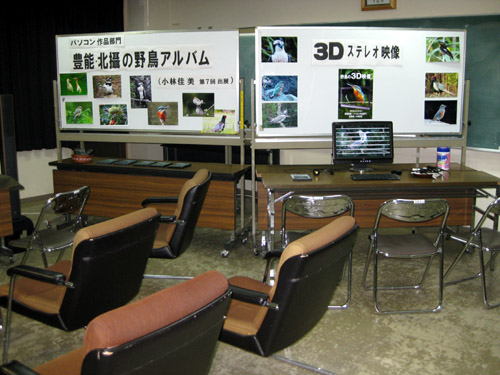 専用メガネをかけて近隣の野鳥や黒川ダリア園のダリアなど、16タイトル(カワセミ、エゾビタキ、ノビタキ、モズ、アオゲラ、アオサギ、ミサゴ、スズメ、ホオジロ、イソシギ、タゲリ、ツグミなど)を用意しました。ディスプレイからぐっと前に突出するのを、楽しく体験されました。長い時間じっと見入っておられた方もいて、当方も驚きでした。