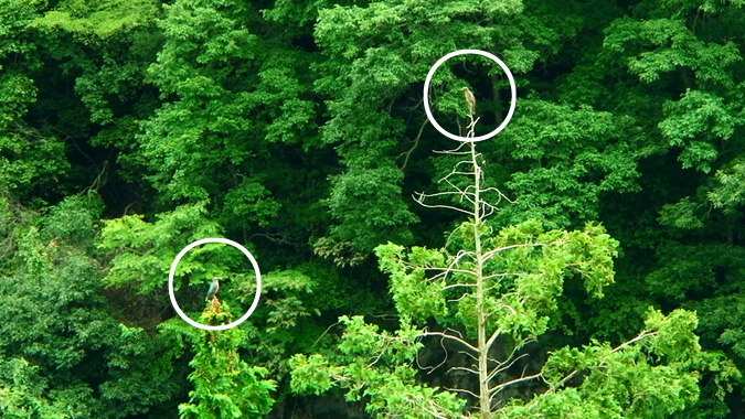 杉の木のてっぺん近くで、餌を受け渡ししていました。左下:オス親、右:幼鳥