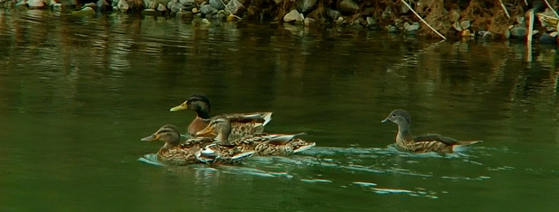なっています。マガモは3羽、なぜかオシドリのメス1羽も一緒です。4羽が泳ぐ向こう岸に、