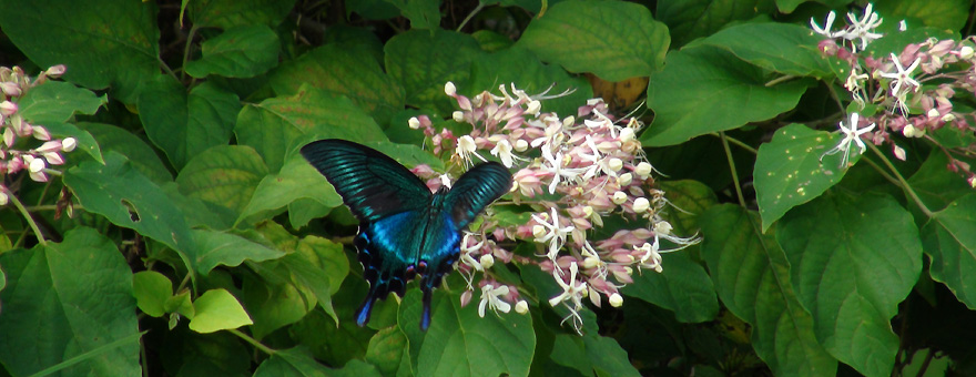 妙見山頂にあるクサギの花にやってきたミヤマカラスアゲハ。構造色がとても綺麗です。