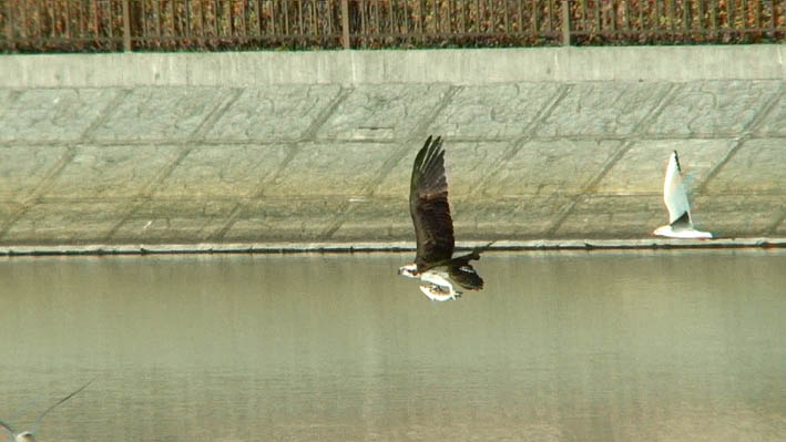 この池には、時折ミサゴが出現します。池の上空を旋回していましたが、突然ダイビング!