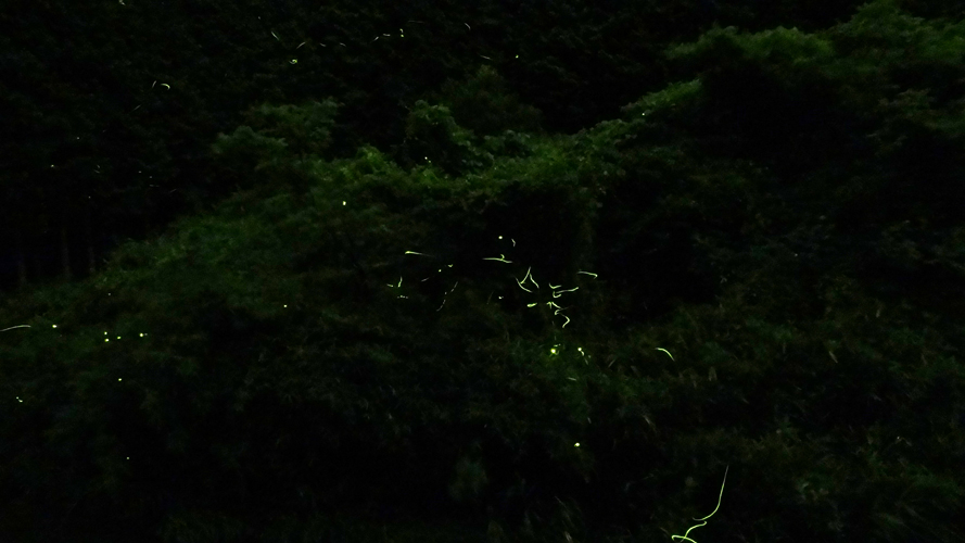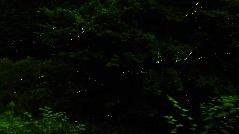 いろんな動きで、また、かなりの高さまでも飛び交う蛍ですが、時には多くが一斉にシンクロナイズ