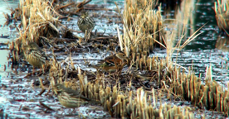 とても小さいためタヒバリは3羽ともフォーカスが甘くなっています。アシカラズ。)