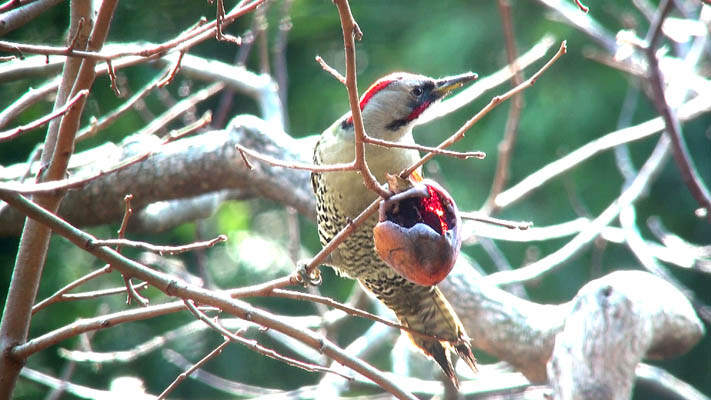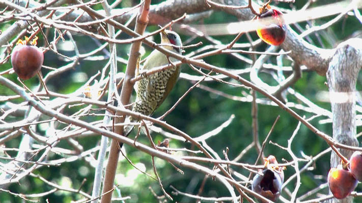 アオゲラが飛んできて、柿の実を目指し、木を登ります。