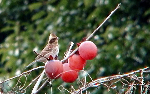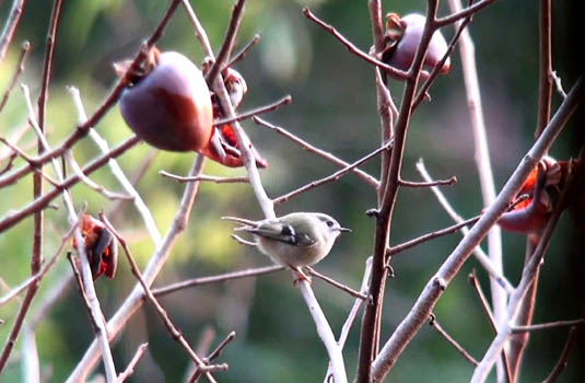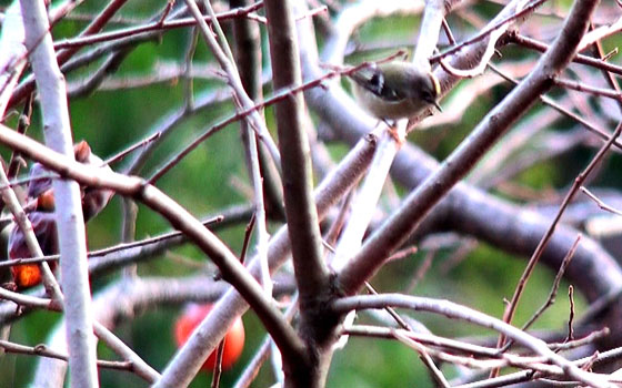 柿の実には種々の鳥がやってきますが、キクイタダキも!