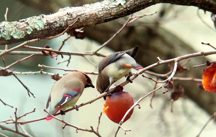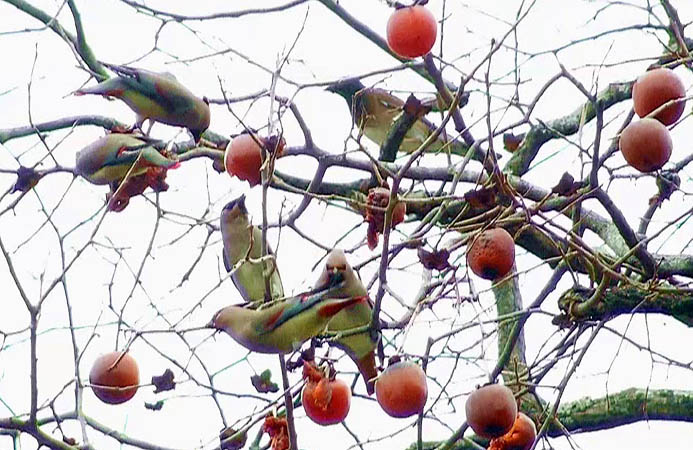 妙見口周辺には、柿の木があちこちに見られます。約30羽のヒレンジャクが