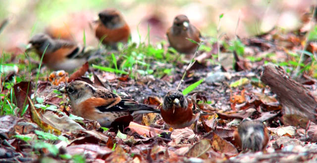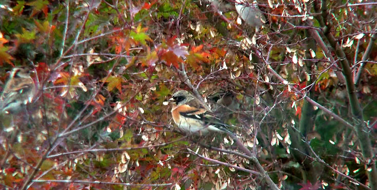 紅葉したカエデに止まり、好物の翼果をくわえているアトリ。地面に落ちた翼果も啄ばみます。