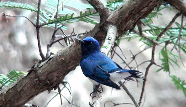 スギやヒノキの上方から、オオルリのさえずりが聞こえてきます。