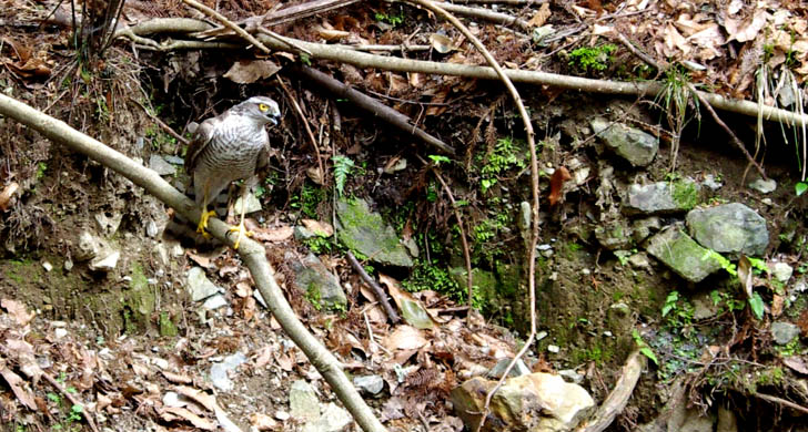 早朝4時からコマドリを期待して初谷川に出かけた齊藤さんが、遭遇したのはオオタカでした。あたりに群れているムクドリの1羽を捕食した直後でした。