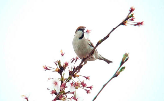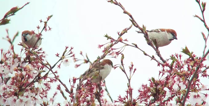 春爛漫の土曜日は、お花見デー。人間たちが桜の木の下でお弁当を広げる一方で、ニュウナイスズメは群れで、“花の蜜”昼食を楽しみます。「桜ラッパ」も見せてくれました。