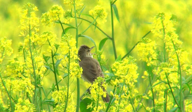 保津川には、セイヨウカラシナが一面に広がり、黄色の長い帯を成しています。セイヨウカラシナの間をあちこちと飛びまわるオオヨシキリ。まだ数は少ないですが、「ギョ、ギョ、ギョ、ギョ」「ギシ、ギシ、ギシ、ギシ」と「ヒュ、ヒュ」