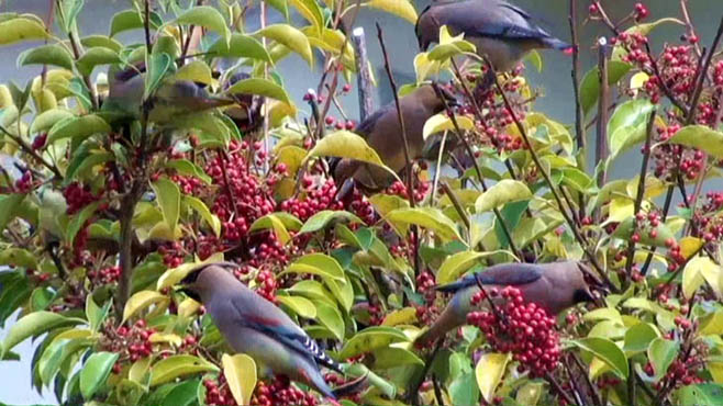 4月5日、住宅地域のクロガネモチノキの実が残りわずかとなっていたころでした。縄張りを主張しているヒヨドリにずっと邪魔をされ続けたヒレンジャクたちですが、ついに我が家の庭のクロガネモチノキにやってきました。辛抱強くヒヨドリの“留守の間”を待ち続けた結果でした!
