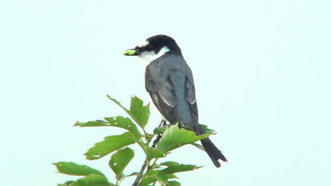 小さな青虫を咥えています。どこか近くで子育て中のようです。木の先端に長らく留まった後、甘い声で「ピリ、リッ」と囀りながら、頭上を飛んで行きました。