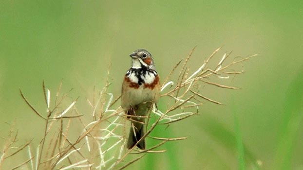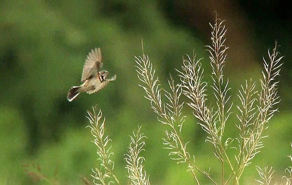この個体はオスで、頭はグレー、胸の黒、白、茶色がくっきり。セイヨウカラシナの枝がお気に入り。時折さえずっています。