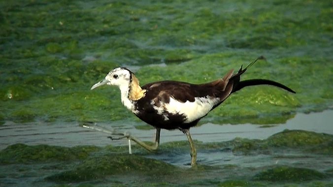近くにお住まいの方によると、綿状の藻は、昨年はなかったそうです。この藻が出現したからこそ、レンカクはやってきたのでしょう。レンカクは、お腹が藻に接するまで沈んでも、それ以上は沈みません。藻の厚みが結構あるため、そして長い足指で体重を分散しているから?。。。藻の上を歩きまわり、藻を啄ばんで虫を見つけ、食べていました。