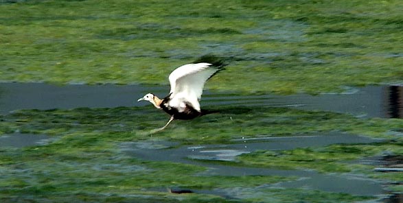 初見のレンカクです。少し若いようですが、白黒のボディーに金色の後頸と、とても綺麗な姿。水面を優雅に歩いていきます。