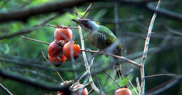 階段そばの柿の実が熟したので、アオゲラが現れました。ヒヨドリの主張を