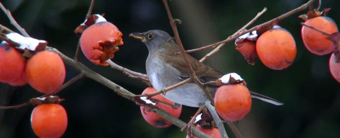 柿の実にやってきたシロハラ。時には15羽ほども一度にやってきます。