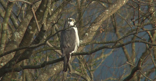 ヒドリガモたちには背を向けて、少し離れた地点の高木に止まるオオタカ。