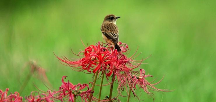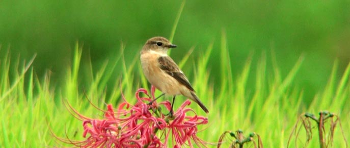 黄金色の田地。緑の畦には彼岸花が満開。その上に止まったノビタキたち。