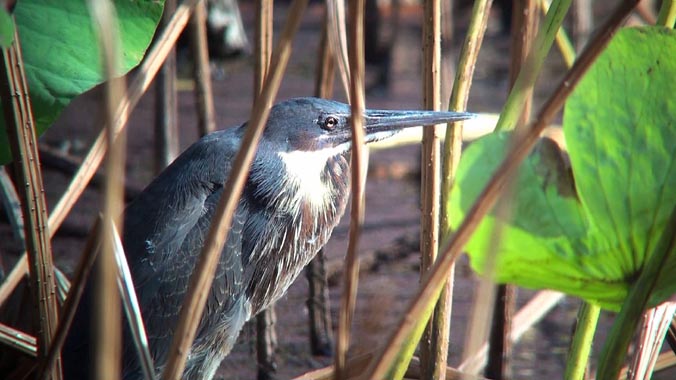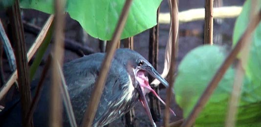 珍鳥のため、大勢の撮影者が詰め掛けていました。人間たちから距離をとり、蓮池の