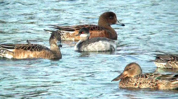 ヒドリガモやハシビロガモ、コガモなど多種が飛来した池で、ハジロカイツブリが混群して