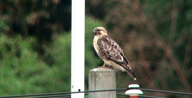 こちらの電柱にはノスリが止まり、眼下を注意深く探しています。