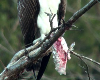 何か下にぶら下げています!よく見ると、大きな魚です。一度に全部は食べきれなかったのでしょうか、