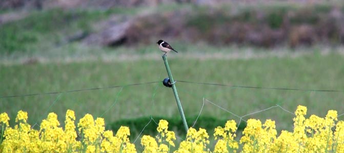 | ある池に向かう途中で出会った旅鳥。 オス、メス計4羽ほどが菜の花畑で杭に止まったり、ブロッコリーの葉に止まったり。 |