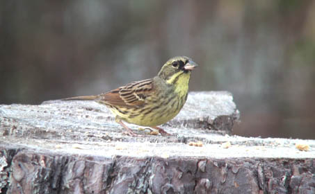 | アオジ、シロハラ、アトリたちの姿の後方の木々には、ミヤマホオジロが数羽止まります。 タイミングを計って切り株の上や地面にやって来ます。左のは、太っているように見えて いますが、実は羽と羽の間に空気をためて防寒しているのです。 |