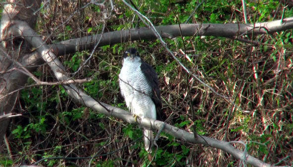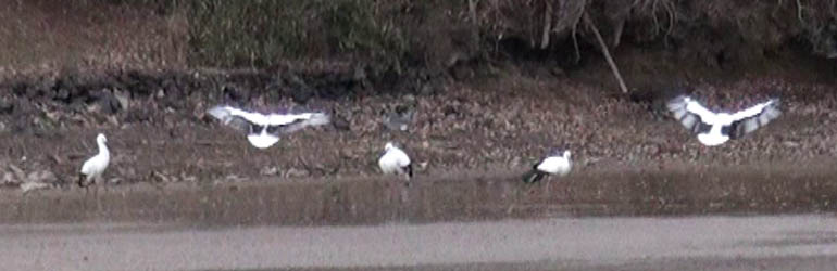 セグロカモメが1羽が並んでいるのが見えました。(1月初旬) おっと!よく見ると、向こう岸の木の枝にはオオタカが鋭い目で、獲物を探していました。 |