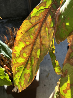 2番目はアボカドの葉。寒さのために?葉緑素がやられてヘンな模様に。でも、西日が差すと