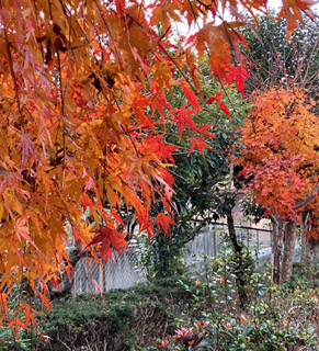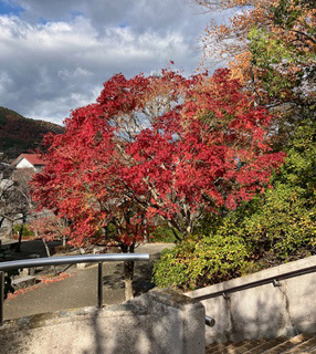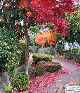 ナンキンハゼ(赤)が例年どおり。また左の写真のように、西公民館の目立つ桜の紅葉と、真ん中はユーベルホール東脇道の紅葉桜、そして写真右は桜の木からの”赤い落ち葉”です。