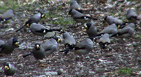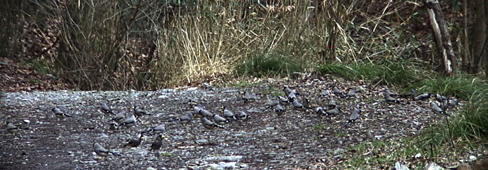 初谷川に沿って川原の広がっているところまで来ると!なんとイカルの群れが餌をついばんでいます。緑の草の右下方にいるのを合わせ55羽を数えました。(撮影:2007.2.11)