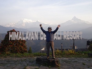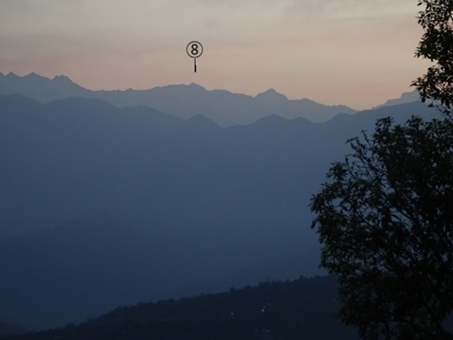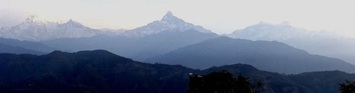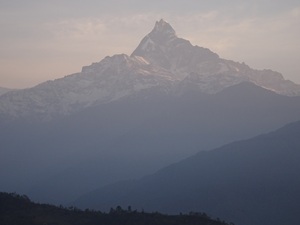 | 一番右端に見えるピークの一つがマナスルだという。 マナスルは日本人が初登頂した山なので親しみを覚える。出来ればもっと近くから見たいものだ! |