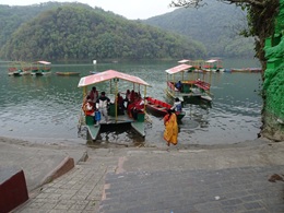 | ペア湖まで下ってボートに乗った。10人ほど乗れる足漕ぎボートである。 しかし、5、6分も乗った時、天気が急変しそうなので引き返す。 晴れていればこの湖からマチャプチャレがマッターホルンのように見えるという。悔しい〜!
