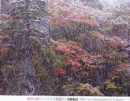 前ページの翌々日の写真です。この朝も目覚めると大雪が積もってました。おとなしく雪の少ない地域に移動しようと、国道にでた途端、目の前を除雪車が山のほうへ走っていくではありませんか! 催眠術にかかったように、ふら〜と除雪車にくっついて行ってしまいました。その後「こりゃいくらなんでも無理だ」というような急坂の手前で、賢明にも除雪車が戻ってくるのを待つ事にしました。その間に、撮った写真です。撮影に夢中になってるうちに除雪車は帰ってしまい、心細くなった私は気休めにと、雪道を走り慣れてる都会の友人に「大丈夫やんなあ?」とヘラヘラ笑って自分を誤魔化しながら電話したら「そっちの状況は、ここからじゃわからないし、第一遠すぎて、どう助けようもない。云々。事故ったら周りにも迷惑かけるんだから、もうちょっと考えて行動するべきだ。云々」と説教されて、余計へこんでしまいました。ごもっともです。反省。数日後、スタットレスに替えるためだけに日帰りで京都信州を往復しました。大変な晩秋でしたが、今思うと去年は紅葉も雪も良かったですねえ |