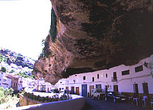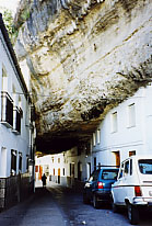 右岸の岩をえぐったようなの家並。南スペインではこの様に天然の岩をそのまま利用した家のある村をよく見かけた。なかでもこのセテニ―ルは複数の家が同じ岩の中に長屋状に連なっていて、岩がそのまま道のアーケードにもなっている。私の感覚から見ると今にも天井が落っこちてきそうな不思議空間。家の部分だけ白いペンキを塗りつけているのも面白い。