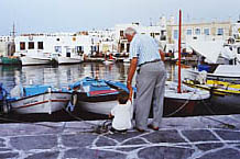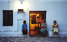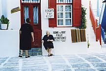 フェリーがミコノスの港に着くと、ものすごい数の宿の客引きが待ち構えてて、部屋の写真を見せながら交渉に入る。(南欧はシーズン中はこういう所が多く、宿には困らなかった。)私は最初に目に付いた眼鏡で小太りのおばさんの5000ドラクマ(2000円くらい)に惹かれ着いて行く事にした。ところが交渉の時は「ミコノスタウンから徒歩5分」が宿に着くと「10分」に変り、実際は15分かかった。そもそも車で来てるって時点で気付くべきだった。とはいえ、となりの部屋の人と共用のテーブル付きベランダがあり、なかなかいい部屋だった。 (参考までに) シーズンを少し過ぎたギリシャでは、リュックを背負って歩いているだけで、「room ?」と声をかけられる。ただしシェスタ(昼寝)の時間までに決めないと、店が閉まってしまうから、彼らが起きてくる夕方まで、重い荷物を引きずって、彷徨う羽目になる。(港の近くには、お金を払って荷物をあずかる場所もあるから、そういう時はそれを利用するとよい) @「ROOMS FOR RENT」〜たぶんシーズンオフは普通の家っぽい「宿」。 とってつけたような看板が嬉しい。 A夕方になると町のあちこちで夕涼みしながらおしゃべりするおじさんおばさんの姿を見かける。 B朝の港でおじいさんと座り込む男の子を見た。夜は賑わうミコノスも、朝は人通りが少ない。 |