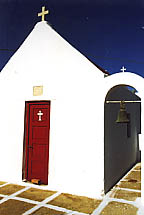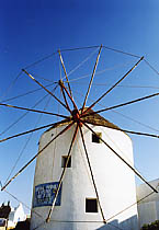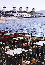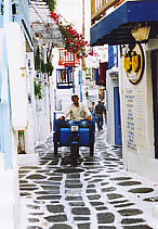 夕方5時頃到着した時は静かな町だったのだが、日が暮れるにつれ、どんどん人が増え活気づいてきた。この町、気のせいか、ゲイっぽいカップルが多いんだけど・・・なかなかかっこいいアーティスト風の(男同士の)カップルがやたら多いんだけど・・・ほんとは写真撮らせてって頼みたい位かっこいいんだけど、ついにそこまでの勇気は出ませんでした。 撮る勇気がなかったといえば、ヌーディストビーチ ミコノスの名物らしいので、私は服を着たまま行ってみたが、あんまり裸に興味のない私は、トンボ帰りのような素早さで帰ってきた。感想としては「外人って大人だな」 日本の海水浴場とは空気が違った。 @あちこちに小さな教会がある。 A道が細いので、車は入れず、この耕運機のような乗り物が活躍。 B見てわかるとおりの風車です。 C風車群を眺めながめながらお食事を。 |