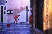 B早朝、観光客が出歩く前に掃除のおじさんが町を磨いている。