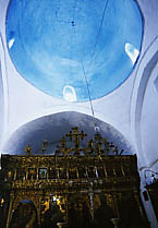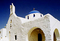 グリークコーヒーは小さめカップで飲む濃い目の粉っぽいカスカスのコーヒーで、好き好きがあるだろうが、私は気に入ってる。水といっしょに来る。カップ2杯分位がポットに入ってくることもある。400ドラクマ位(約120円) 暑い時はグリークアイスコーヒーを飲む。700ドラクマ位(約210円) このコーヒーは上1/3が濃厚な泡で、私はこれを勢いよく混ぜて下のコーヒーとミックスさせて飲むが、しばらくするとまた上下に分離する。混ぜては飲み、また混ぜては飲む。 ギリシャではギロピタもおすすめ。500ドラクマ位で、回転焼肉器で廻ってる肉をナイフで削り取り、トマト、玉葱、時には香草やフライドポテトなんかといっしょに、薄いパンのような「ピタ」に挟んでくれる。マヨネーズ味。これをふたつも食べれば、けっこうお腹もふくれる。手軽で安くて美味しくて栄養もありそうで、しょっちゅう食べた。 @井戸。今も使っているらしい。 Aパリキアのはずれで見つけた教会。 B中に入ってみた。青いドームは内側も青かった。大発見な気分! |